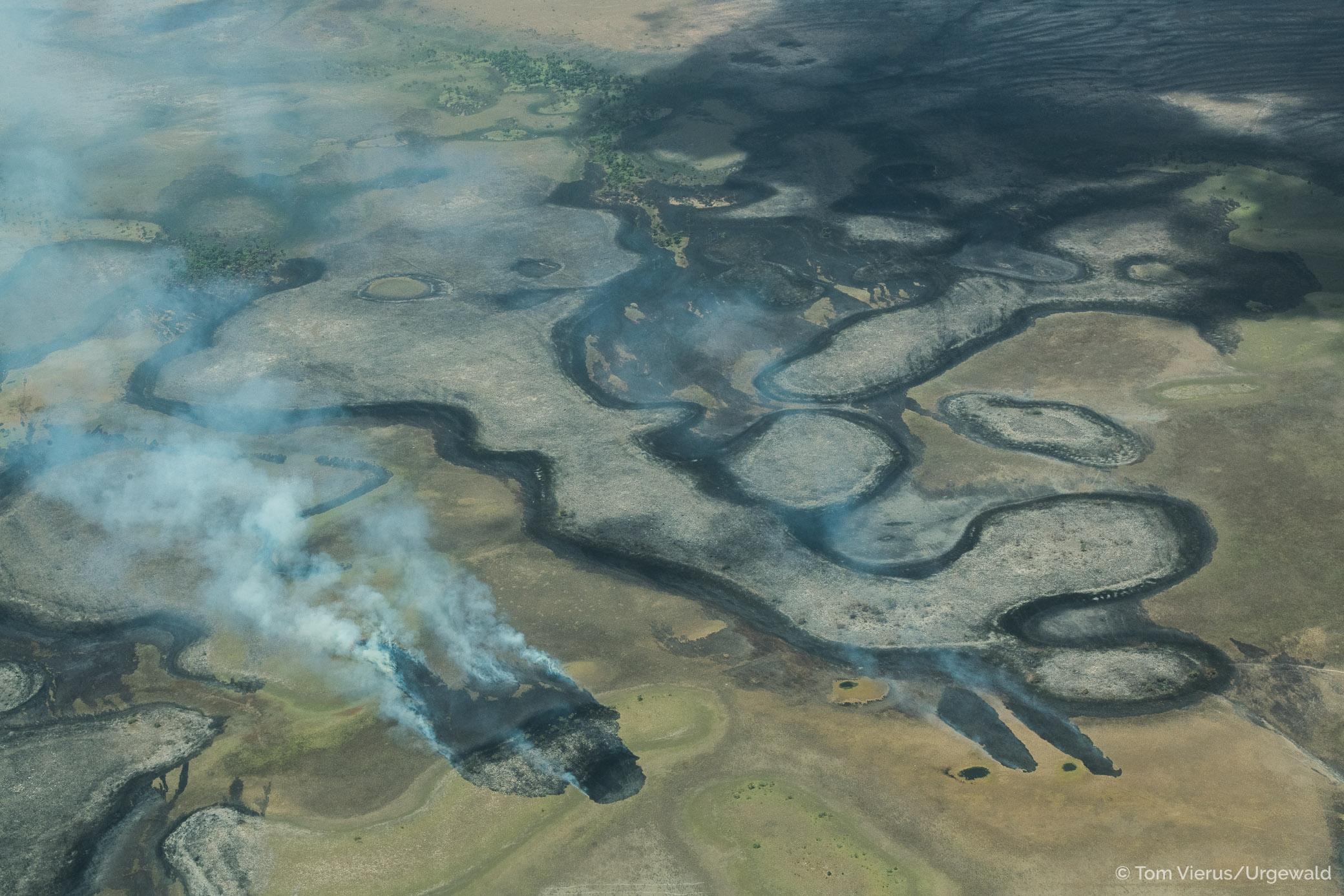 Vast stretches of land burnt and burning bushland in the area of Lethem, close to the Brazilian border in the south-west of Guyana.