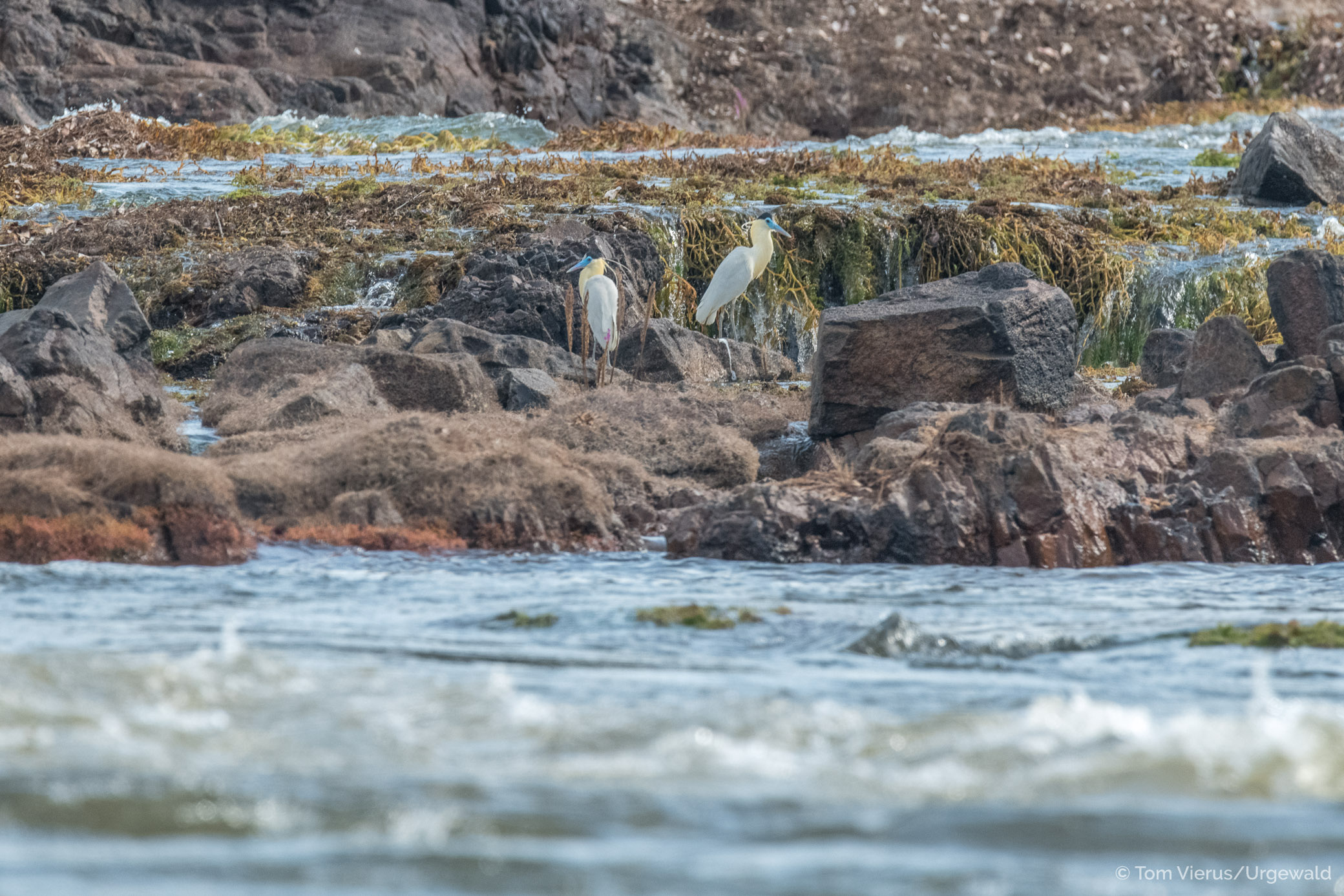 Two capped herons (Pilherodius pileatus) forage on rapids of the Essequibo river in the Iwokrama Forest in Guyana.