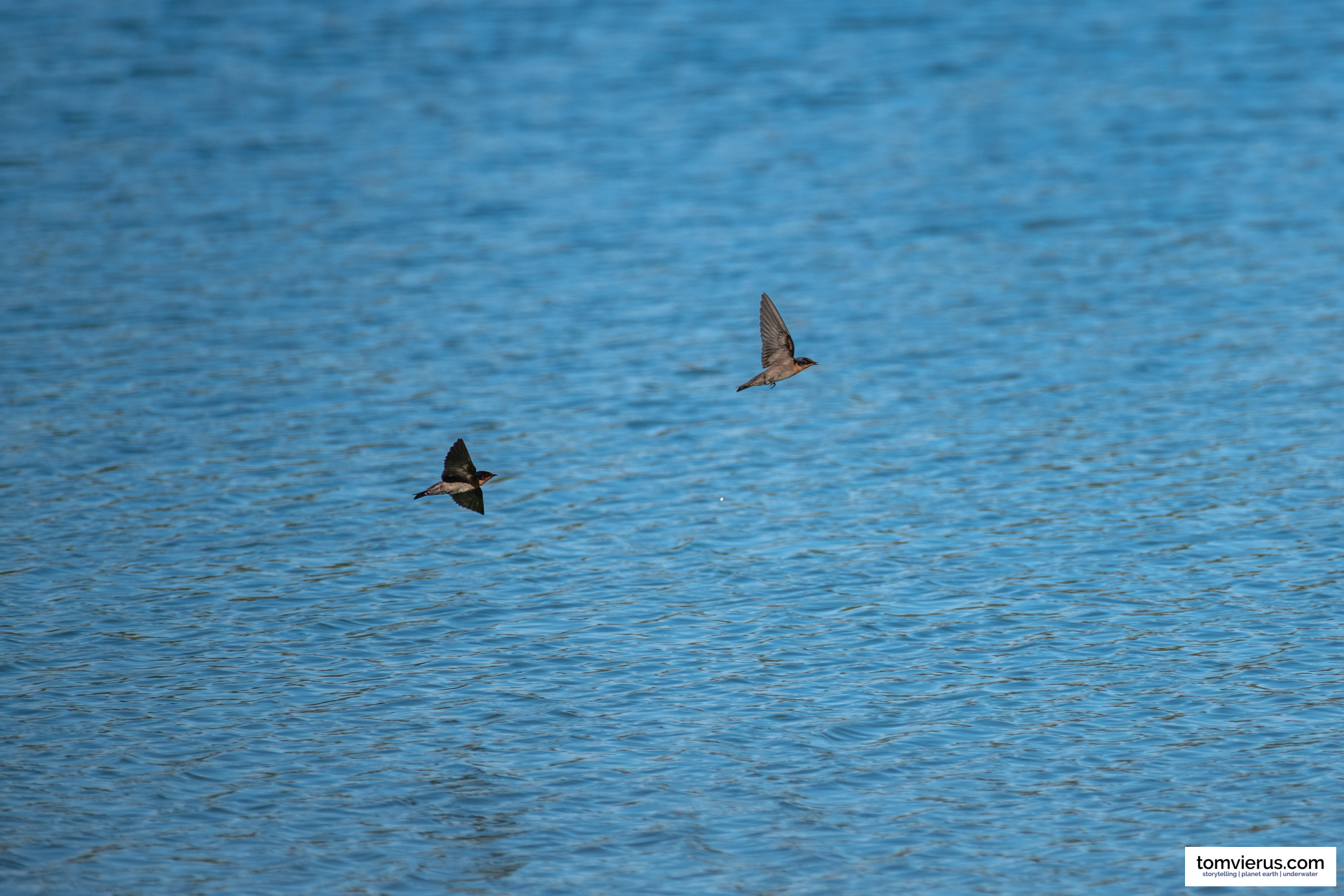 Two Pacific Swallows (Hirundo tahitica) flying over the lagoon of the Marriott Resort in Momi Bay.